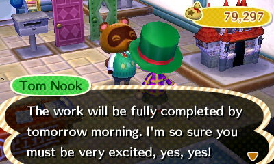 Before I let Gracie judge me I finally remembered to talk to Tom Nook about my house upgrade. An extension of my right room will be finished tomorrow.